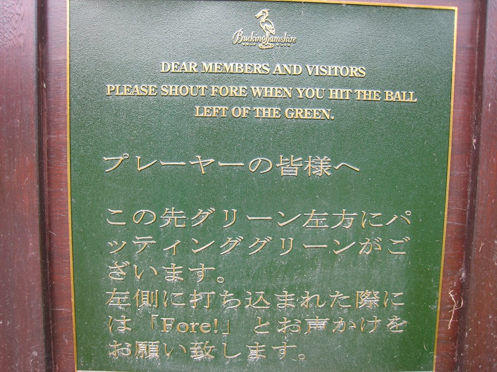 Hoffentlich versteht das auch jeder. Vorletzte Zeile ist vielleicht nicht zu übersetzen… Gesehen am Abschlag von Loch 9 in „The Buckinghamshire“, Denham. Bericht über den Platz folgt.