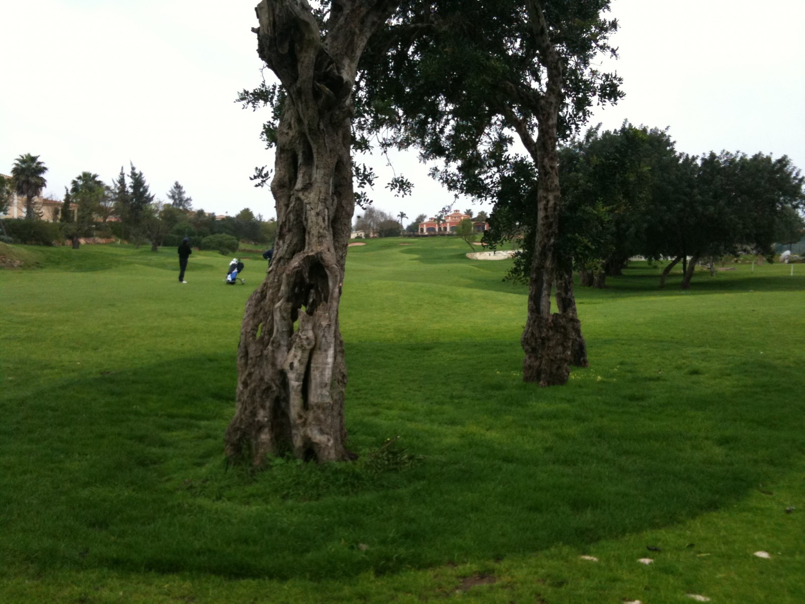 Spielerisch hält sich die Herausforderung – wie bei den meisten Plätzen, die auf Greenfee-Spieler ausgelegt sind – allerdings in Grenzen. Wenn Bälle verloren gehen, dann allenfalls in den angrenzenden Villen, den wenigen Teichen auf den Back Nine oder wie momentan durch eingebohrte Bälle in den vom Regen aufgeweichten Fairways. Die größte Herausforderung stellt vermutlich der Wind da. Wenn die steife Atlantik-Brise so weht wie heute, ist der Platz ein Witz. An einem der kürzeren Par 5s landete ich beispielsweise mit Driver – Eisen 8 hinter (!) dem Grün. Wenn der Wind jedoch aus der entgegengesetzten Richtung kommt, spielt sich Gramacho natürlich unendlich schwieriger. Besonders, weil die sehr harten und schnellen Grüns kaum einen Ball halten. Wenn möglich sollte man den Ball schottisch flach rauflaufen lassen, ansonsten werfen die Grüns selbst ein Eisen 9 ab wie ein Rodeopferd seinen Reiter. Vor allen Dingen aber sollte man um jeden Preis die Bunker meiden. Die haben bis auf wenige Ausnahmen zwar keine hohen Bunkerwände, doch der Sandpegel ist so niedrig, dass es schon ein Kunststück ist den Ball daraus mit einem Schlag auf dem Grün zu platzieren.