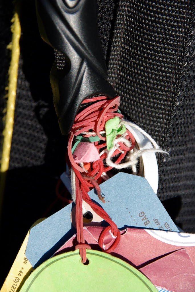 Wenn man viel unterwegs ist und fast immer auf anderen Plätzen spielt, bleibt es nicht aus, das man sein Bag mit den bekannten Schildern ausrüsten muss. Und wer dann noch nicht regelmässig seinen Griff von den Bändern und Gummis befreit, bei dem sieht nach einer Zeit der Griff aus wie früher das Handgelenk von Wolfgang Petry. Vielleicht sollte ich doch mal ein Schere einsetzen… Oder vielleicht doch nicht? Sind ja auch nette Erinnerungen dabei.