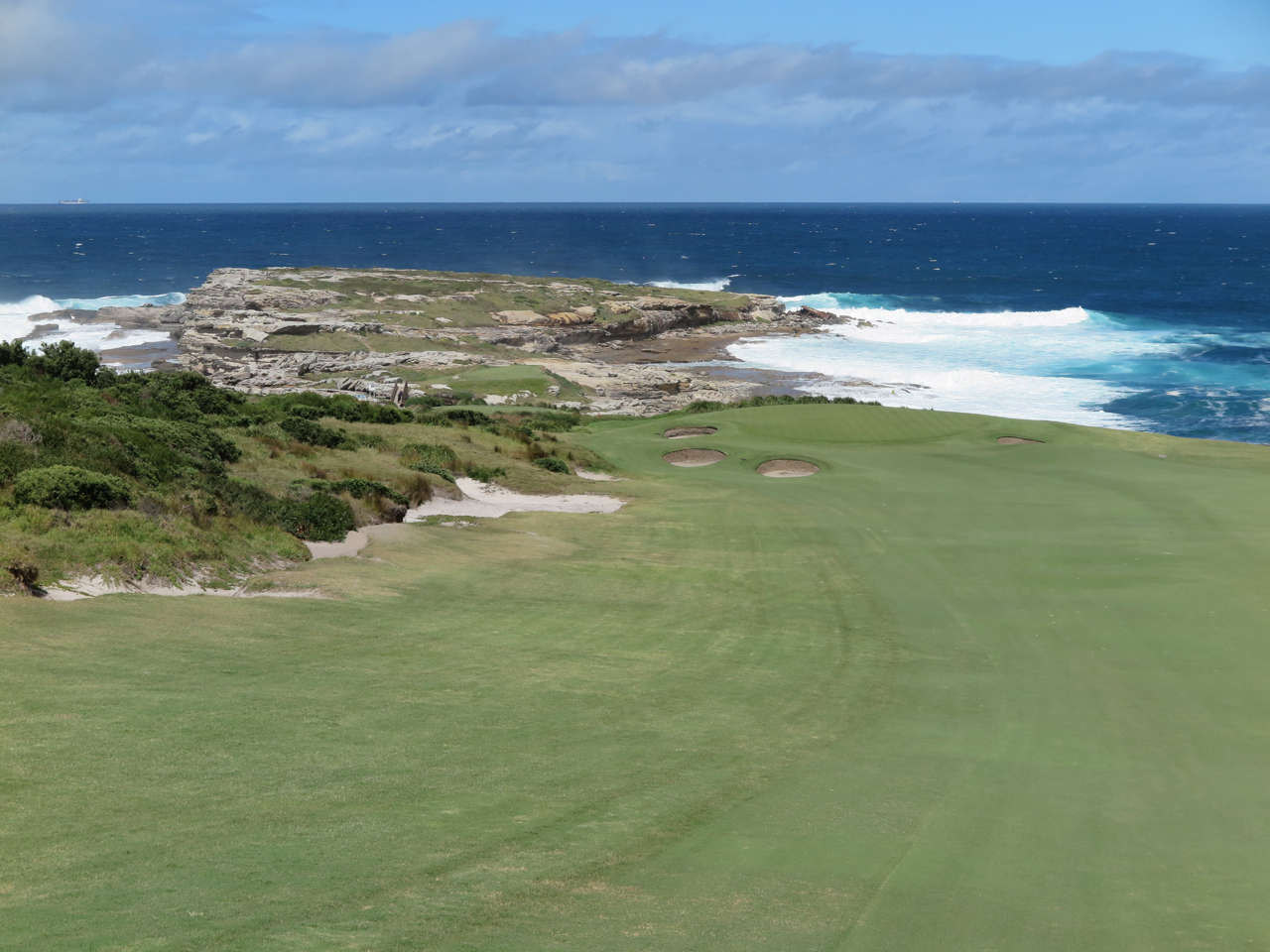 Der Platz (derzeit bei GOLF DIGEST auf Platz 33 in der Welt) beginnt verhalten mit einem kurzen Par und einem mittellangen Par 3. Beide waren durch erhöhte und sehr schnell Grüns gekennzeichnet. Loch 3 ist dann schon interessanter. Blinder Abschlag und dann Dogleg nach links. Das Par 4 an Loch 4 war eher eine Art „Transportloch“ auf dem Weg zum visuellen Höhepunkt des Platzes im New South Wales GC. Das Par 5 von Loch 5 startet mit einem blinden Abschlag über eine Menge Gemüse. Schlag 2 ist dann wieder blind zu schlagen. Ein Hügel auf dem Fairway. Wenn man dann den Hügel bestiegen hat und den Ausblick sieht, ist man erstmal atemlos. Nicht wegen des Weges den Hügel hinauf, sondern wegen des großartigen Blicks auf über Botany Bay Richtung Pazifik. Jeder Flight, der zum ersten Mal dort ist, stoppt erstmal und macht Fotos. Ich glaube, diese Pause ist bei der empfohlenen Spielzeit schon einbezogen. Am Ende des Fairways wartet dann das auf Felsen gebaute Grün und der berühmte Abschlag von Loch 6. Einfach schön.