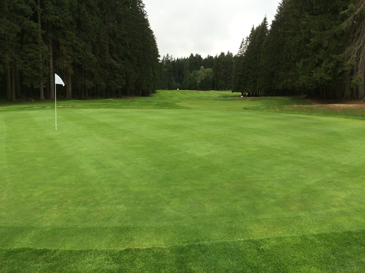 Die beiden anderen Plätze vorher waren in Ordnung und nun war ich natürlich gespannt, was mich auf dem Platz in Marienbad erwartet. An den anderen Tagen zuvor hatten wir den Platz auf dem Weg zum Hotel einige Mal passiert. Machte einen normalen und flachen Eindruck. Loch 1 beginnt dann auch so, wie man es vorher erwartet. Flach durch einen Wald. Nichts besonderes. Ab Loch 2 wurde es dann spannender. Ein kurzes Par 5 bergab, bei dem man das Ziel erst ab dem zweiten Schlag sieht. Das Grün kann der sehr gute Spieler auch mit dem 2. Schlag angreifen. Aber der erwünschte Erfolg ist nicht immer garantiert. Vor dem Grün ist ein tiefer Wassergraben und dahinter beginnt der dunkle Wald mit Pilzsuchern im Herbst. Der Platz ging abwechselnd weiter. Die Grüns sind im Vergleich zu modernen Plätzen eher klein und nicht so schwer, wenn mal drauf ist. Das machte aber nichts, da die Grüns fast immer auf andere Art gut geschützt waren.