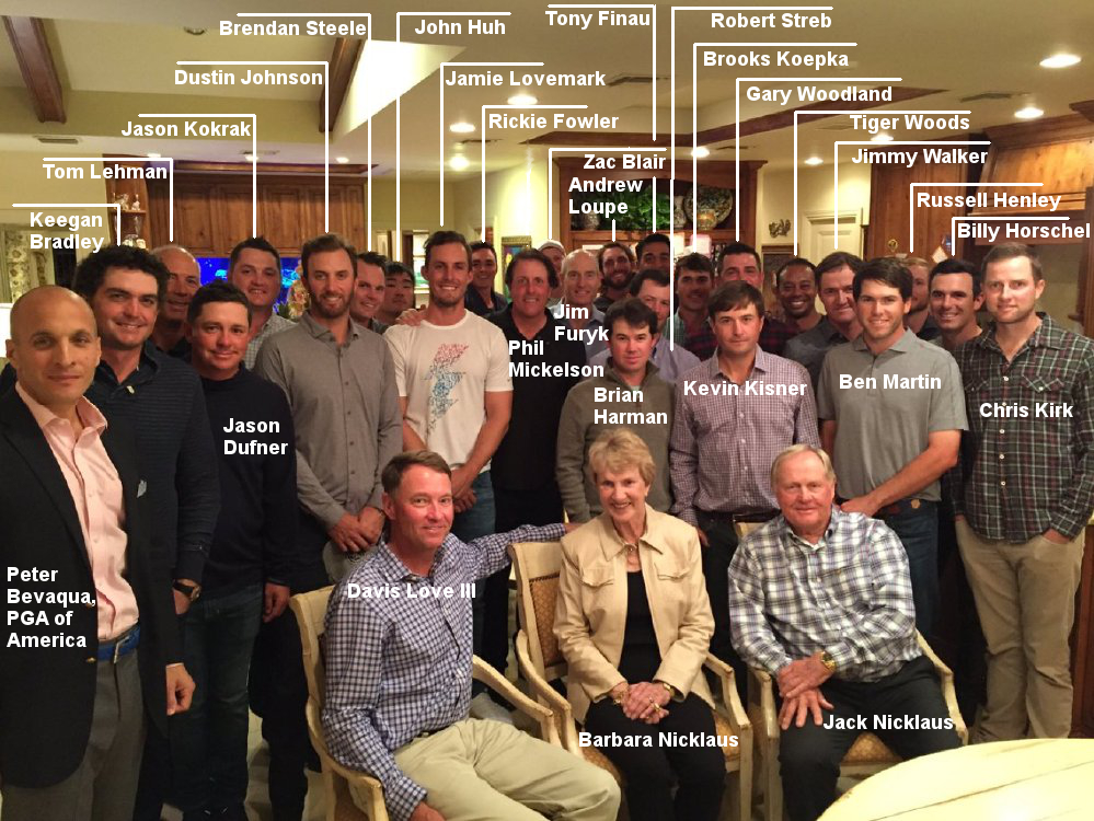 Denn obwohl Dustin Johnson eigens für dieses Ryder-Cup-Dinner anreiste (er spielt nicht die Honda Classic), könnte man aus den fehlenden Spielern eher ein angsteinflößendes Team machen als aus den Anwesenden. So fehlten aus den Top 50 der Welt Jordan Spieth, Bubba Watson, Patrick Reed, Brandt Snedeker, Zach Johnson, J.B. Holmes, Kevin Na, Matt Kuchar, Justin Thomas, Bill Haas und Scott Piercy. Stattdessen waren mit Andrew Loupe und John Huh sogar zwei Spieler dabei, die in der Weltrangliste sogar noch hinter Kapitän Davis Love III platziert sind. Doch wer war denn nun genau vor Ort? Die obskure Gästeliste in Kombination mit der Tatsache, dass man Golfer selten ohne Mütze sieht (by the way: grobe Etiketteverletzung im Hintergrund, Mr. Blair) machte es schwer den Gesichtern Namen zuzuordnen. Deshalb haben wir einmal das Bild als Hilfestellung beigelt.