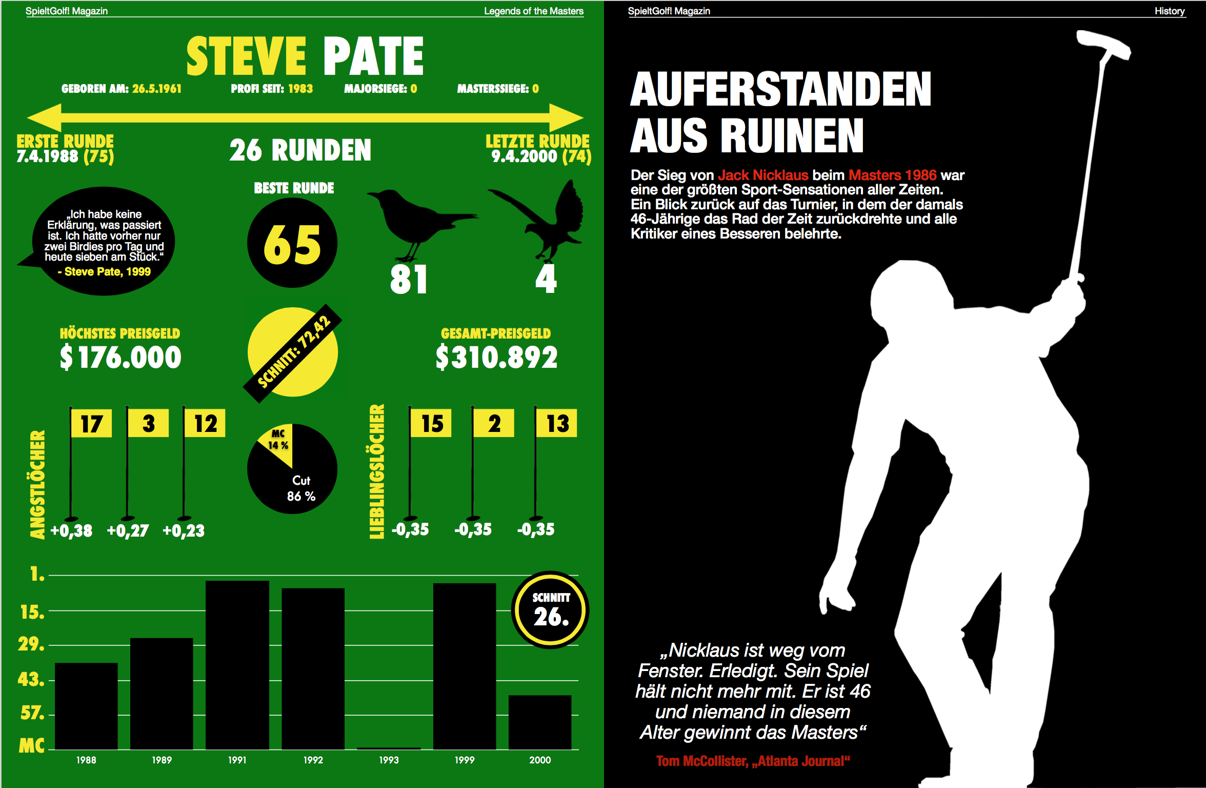 Dazu gibt es u.a. natürlich wie immer die Übersicht über den Platz, alles Wissenswerte über die 89 qualifizierten Spieler, und zum ersten Mal in diesem Jahr Infografiken über einige Legenden des Masters: Sieger wie Arnold Palmer und Byron Nelson, aber auch Geschlagene wie Greg Norman und Ken Venturi.