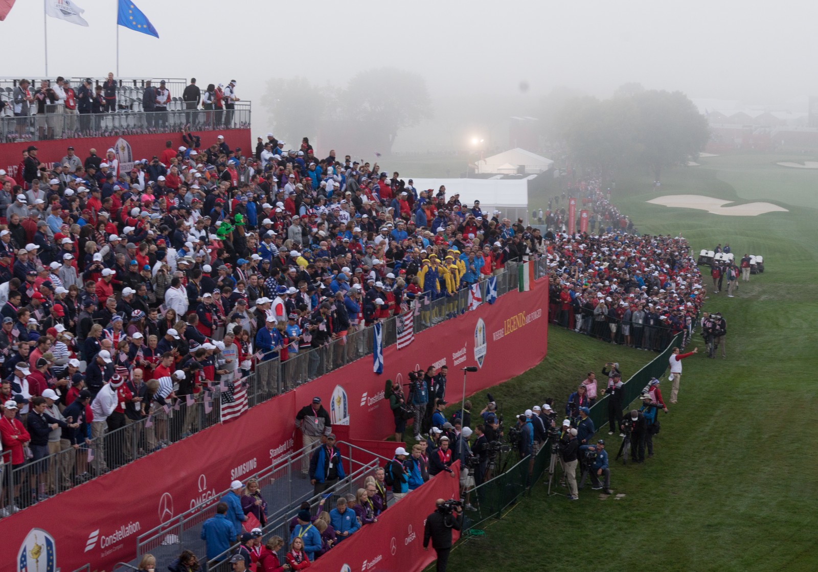 Das größte Problem ist jedoch, dass das Fanerlebnis Ryder Cup sehr frustrierend sein kann – besonders wenn man, wie angeblich in Hazeltine geschehen, mehr Tickets verkauft, als die Anlage verkraften kann. Der typische Tag eines Ryder Cup Fans sieht folgendermaßen aus: Der Hardcore-Fan steht morgens um 6 Uhr vor den Toren, um einen Tribünenplatz am First Tee zu bekommen und sucht sich anschließend einen Platz auf den späteren Löchern für den Rest des Tages. Der nicht ganz so fanatische Zuschauer verzichtet aufs erste Tee und versucht irgendwo, wo noch Platz ist, in die erste Reihe zu kommen. Im Grunde genommen ist das Ryder-Cup-Fan-Erlebnis wie die Tour De France. Man verfolgt die Ereignisse auf den großen Videoleinwänden, bekommt dann am Freitag und Samstag zwei Mal vier Flights für fünf Minuten zu sehen und muss den Rest wieder auf der Leinwand sehen.