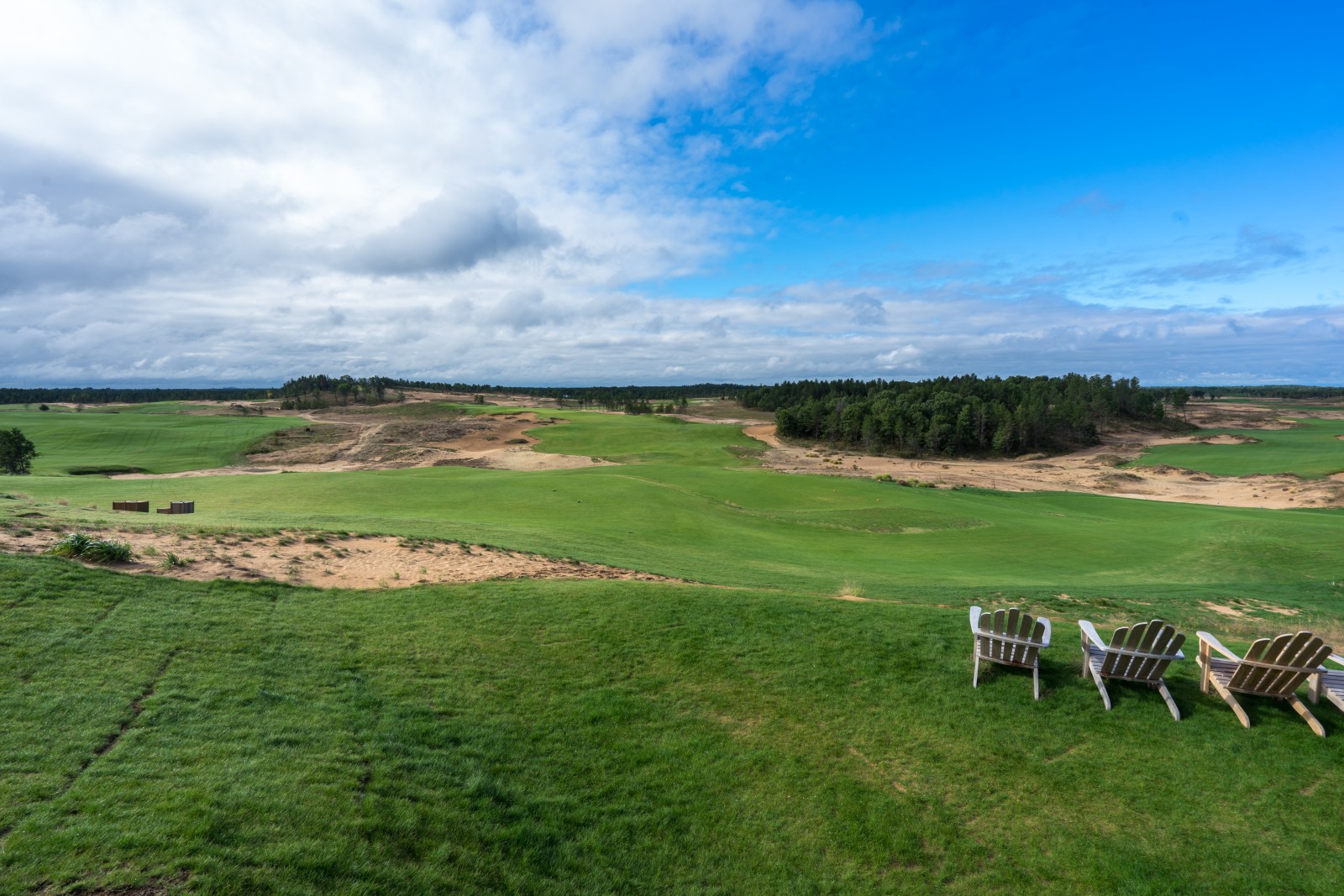 Das Resort im Nirgendwo von Wisconsin ist das neueste Prestigeprojekt von Mike Keiser. Der Eigentümer von Bandon Dunes will sein Erfolgrezept aus dem pazifischen Nordwesten in den Mittleren Westen übertragen. In den nächsten Jahren entstehen hier vier Golfplätze (zur offiziellen Eröffnung des Coore-Crenshaw-Platzes im Juni 2017 sollen auch die ersten 6 Löcher des zweiten Platzes von David McLay Kidd bespielbar sein), zahlreiche Lodges und ein Clubhaus. Bisher ist alles aber noch eine einzige Baustelle. Der Weg zum Platz führt über eine Schotterstraße, die vor ein paar Hügeln Sand und einem Container endet, in dem sich der Pro-Shop befindet. Überall stehen Baumaschinen herum – und dazwischen sprießen wie in einer Oase 18 Spielbahnen.