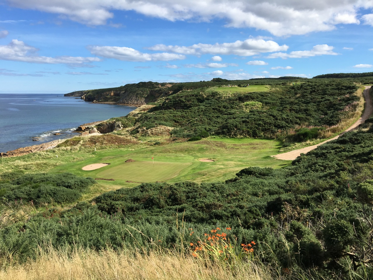 Das Loch ist nur 150 yard lang und befindet sich in einem Tal. Vor 3 Seiten Ginsterbüsche und von einer Seite Felsen und Meer. Ein echter Hingucker. Man kann sich gar nicht satt sehen. Aber irgendwann muss man auch schlagen. Und das ist sicher ok. wenn der Wind still ist und man viel Erfahrung mit Schlägen bergab auf ein kleines Grün hat. Anscheinend haben das nicht alle. Bei uns in der Gruppe haben nur 4 von 13 das Grün getroffen…