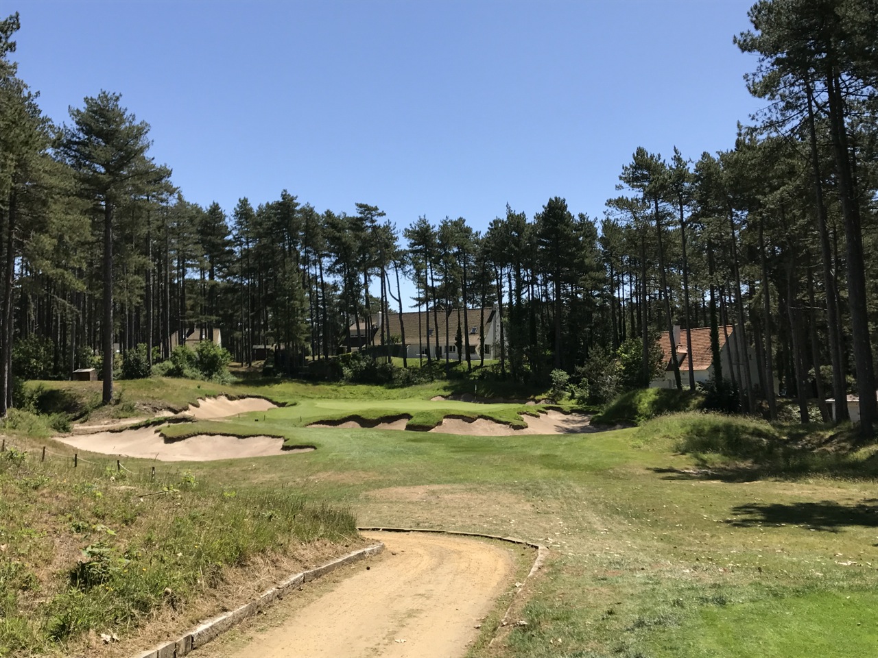 Zum Abschluss bietet Hardelot Les Pins noch ein nettes Par 4, bei dem man sehr gut erkennen kann, dass der Platz auf Sand gebaut ist. Mit über 400 Metern etwas länger, ist dem Normalspieler zu empfehlen vorzulegen und auf ein Bogey zu bauen. In der Mitte des Fairways besetzen 2 Crossbunker knapp 2 Drittel der Landezone, wenn man knapp 190 Meter carry schlägt. Entweder landet man in den Bunkern oder man hat es noch über 200 Meter zu dem, wie üblich gut geschützten Grün. Der Bogey ist in unserem Flight übrigens nur einem gelungen. Der Rest war glücklich über eine 6.