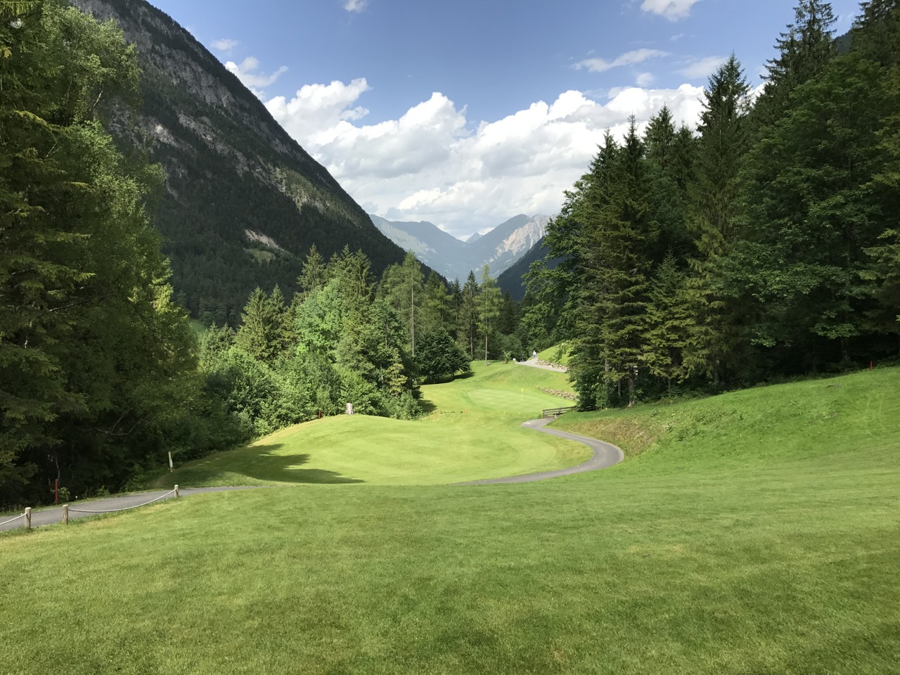 Im Juli war es dann so weit. Von Lech aus waren es etwas über 40 Minuten zu fahren. Viele Serpentinen, eine Schnellstrasse und schöne Landschaften. Im Brandnertal beim Club angekommen habe ich erstmal geschaut, wo denn hier überhaupt ein Golfplatz ist. Zu sehen war eigentlich nur ein Puttinggrün, Teile eines Fairways, ein größeres Grün und eine tolle Berglandschaft. Gut versteckt schien der Golfplatz.