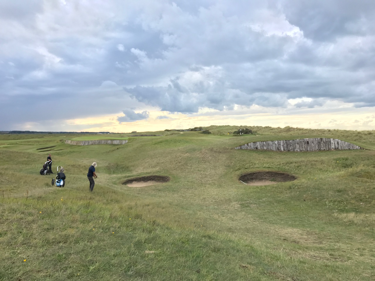 Loch 18: Abschlag und Fairway dieses mittellangen Par 4 sind keine gr0ße Schwierigkeit. Wie so oft in Brancaster ist es das Grün, welches im Kopf bleibt. Quer vor dem Grün ist ein sehr breite und recht enger Bunker mit Eisenbahnschwellen platziert. Chip and Run ist hier nichts. Man sollte seine Pitches hier schon beherrschen.