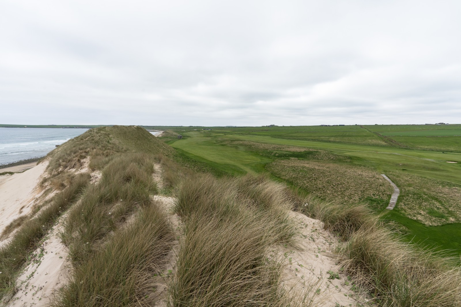 Mit der 14 kommt man dann endlich Sinclair’s Bay nahe. Nur eine (sehr hohe) Düne trennt den Golfer noch vom Wasser. Das Par 3 hat ein wunderbar erhöhtes Grün, wodurch es auch den Namen Plateau trägt. Ähnlich verhält es sich auch mit der 15. Das Tee der 16, wie die 15 ein 351 Meter langes Par 4, ist in die Düne gebaut. Hier lohnt es sich allerdings, einmal auf die Düne zu kraxeln, um den Ausblick über die Sinclair’s Bay und den Wick Golf Club zu genießen. Ein majestätischer Anblick. Genau wie der Abschlag der 17, bei dem man über den Kamm einer Düne spielen muss, und der Abschlag der 18, der von einem erhöten Tee zum Clubhaus zurück führt.