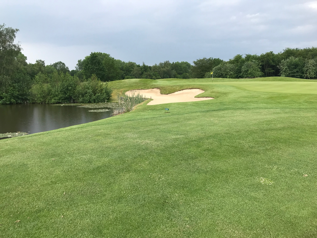 Der B-Kurs gefiel mir dann etwas besser. Mehr Abwechslung. Es geht auch gelegentlich etwas rauf und runter. Die beiden Par 3 hier fanden auch mehr mein Wohlgefallen. Nett ist auch der Ausflug in den Wald an der 6 und 7. Die beiden Löchern waren ganz anders als der Rest und ich fragte mich kurz, ob ich mich vielleicht verlaufen haben könnte. Richtige Parklandlöcher mit engen Fairways im dicht bewachsenen Mischwald. Nach einem langweiligen Par 5, bei dem durch Bunker vor und um das Grün versucht wurde, etwas Spannung zu erzeugen. Das ist interessant, wenn die großen Jungs das Loch mit dem zweiten Schlag angreifen. Für die „Normalos“, wie mich, war das nichts besonderes.