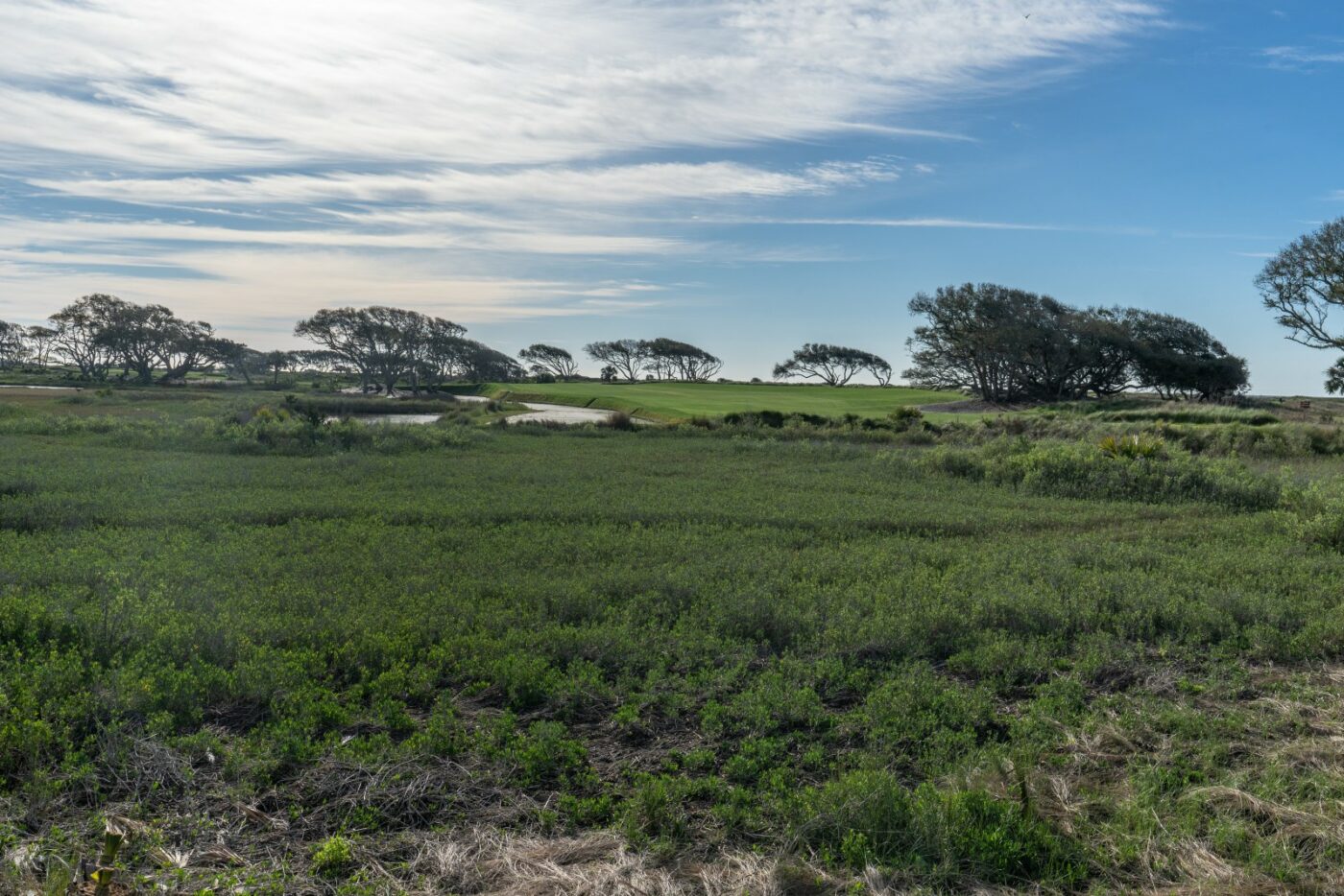 Die erhöhten Grüns sind ein Stilelement dieses Platzes und richtig eingesetzt auch extrem cool. Ein positives Beispiel ist die kurze 3 (356/291 Meter), auf der dank eines breiten Fairways die meisten maximal ein kurzes Eisen ins Grün haben dürften. Das kleine, erhöhte Grün sorgt dafür, dass die Konzentration dennoch hoch bleiben muss. Die 4 (414/367 Meter) ist das am schwersten geratete Loch auf dem Platz und wieder einer der Fälle, wo die meisten zwei Mal den längsten Schläger im Bag zücken und auf ein Up-and-Down hoffen müssen. Das ist vermutlich auch auf der 5 die beste Strategie, denn das Par 3 (190/161 Meter) wird meist mit WInd von vorne links gespielt und hat ein langgezogenes Grün in Form einer Sanduhr. Und so geht die Runde auf dem Kiawah Island Ocean Course weiter, die in Form einer 8 zwei Mal zum Clubhaus zurückführt.